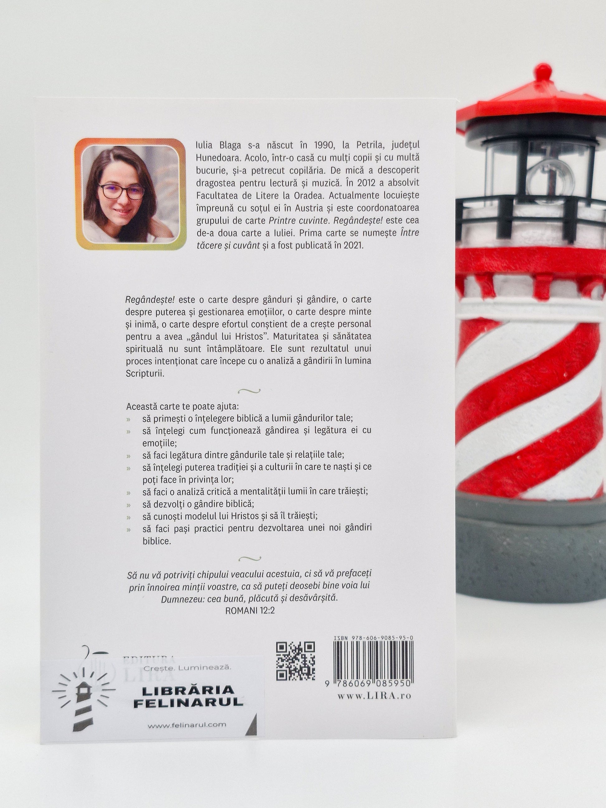 Iulia Blaga s-a născut în 1990, la Petrila, județul Hunedoara. Acolo, într-o casă cu mulți copii și cu multă bucurie, și-a petrecut copilăria. De mică a descoperit dragostea pentru lectură și muzică. În 2012 a absolvit Facultatea de Litere la Oradea. Actualmente locuiește împreună cu soțul ei în Austria și este coordonatoarea grupului de carte Printre cuvinte. Regândește! este cea de-a doua carte a Iuliei. Prima carte se numește Între tăcere și cuvânt și a fost publicată în 2021.